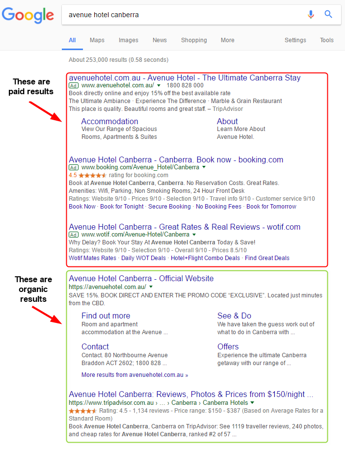 Paid search on the other hand are basically advertisements and involve platforms like Adwords and Bing Ads. A company has paid Google to display their webpage above other sites and organic listings in a bid to get the user to click through and purchase or enquire about a product or service. One way to tell a paid ad from an organic ad is to look for the